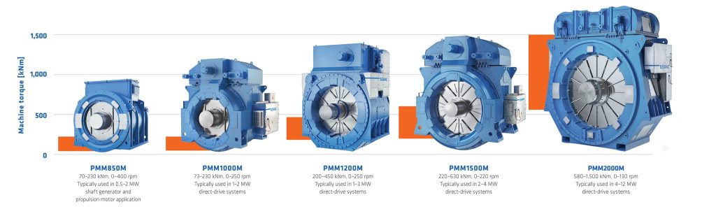 Our permanent magnet machines can be operated as a generator or a motor. They are ideal for large low-speed, direct-drive two-stroke engines. Our propulsion motors offer high efficiency with a large speed range.